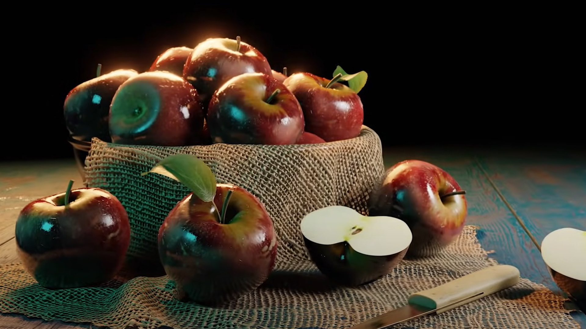 There are three different ways to model an object in 3D space. The fruit bowl and wooden table use Hard-surface modeling, which is when you create a 3D object using geometric shapes. The apples represent Organic modeling, which is when you create a 3D object by sculpting it like you would with clay. Lastly, the cloth beneath represents Soft-Body Modeling, which is when you create a 3D object by simulating real-world physics.